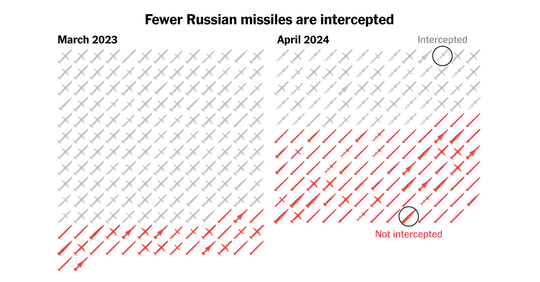 The Instances analyzed a whole bunch of statements launched by the Ukrainian Air Drive over the previous yr that detailed the quantity and forms of missiles fired by Russia and intercepted by Ukraine over that interval. Whereas the info can’t be independently verified, specialists who research the conflict say it’s broadly dependable.