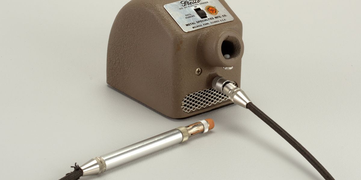 The Loren Specialty Manufacturing Co. arrived late to the electrical eraser sport, introducing its first such product in 1953. Held within the hand like a pen or pencil, the Presto electrical eraser would vibrate to abrade a small space in want of correction. The corporate spun off the Presto model in 1962, concerning the time the Presto Mannequin 80 [shown at top] was produced. This explicit unit was utilized by officer employees on the New York Life Insurance coverage Co. and is now housed on the Smithsonian’s Cooper Hewitt.